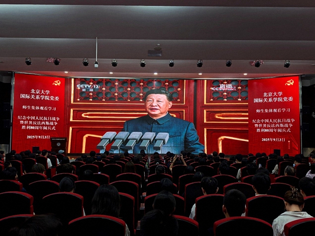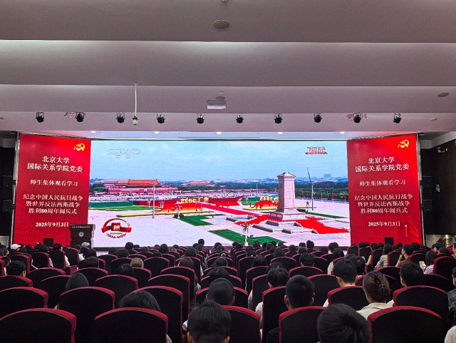 2025年9月3日上午,举世瞩目的纪念中国人民抗日战争暨世界反法西斯战争胜利80周年大会在北京天安门广场隆重举行。北京大学国际关系学院党委书记康涛、副院长祝诣博、党委副书记张昕扬等党政领导班子成员,师生党支部书记、教职员工代表、离退休教职工代表、学生党员和入党积极分子、团学青年骨干、留学生代表等200余名国际关系学院师生在秋林报告厅共同收看大会直播,同时各教工党支部、学生党支部、团支部组织师生线上线下收看直播,深刻体悟大会精神,激发磅礴奋进力量。