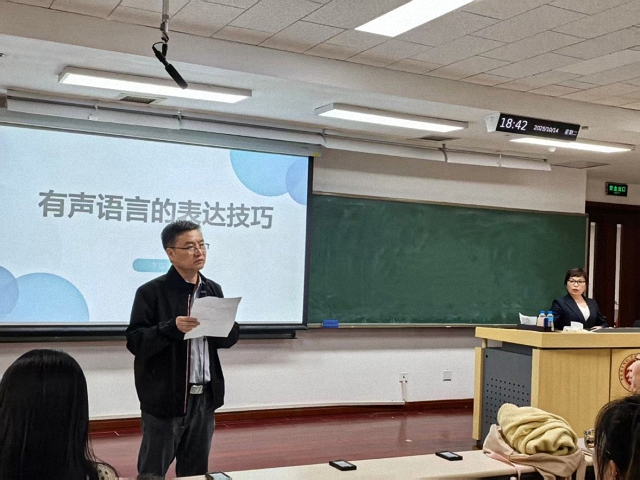李瑞英老师结合数十年的播音与传媒经验,系统阐释了语言表达的核心原则与实践方法。她指出,语言表达应兼顾语言符号与非语言符号的协同作用:前者可分为宣读式、交流式、叙述式和即兴式四种类型,后者则需做到内容协调、对象融合、环境契合与自我定位准确。真诚是表达的灵魂,这种真诚源于真实经历与真切情感。李老师以天安门国旗班战士和九三阅兵中和平鸽的故事为例,生动诠释了情感共鸣在传播中的力量。在表达准备与提升方面,李老师建议,自我介绍应避免冗余词语,注重情感融入与真实呈现;“充分准备是自信的基础”,在传播容错率下降的时代,更应从他人经验中汲取教训。她强调,表达内容应契合时代语境,引用要自信自然。中国人在情感传递上可更为鲜明有力,同时应珍视汉语的音韵之美,彰显语言与文化的深厚联系。最后,李老师总结了媒体传播的四项规律:抢占舆论制高点、细节决定品质、推进好感传播、提升应对能力,并勉励青年学子努力学习,把握时代机遇,成为“讲好中国故事”的骨干力量。