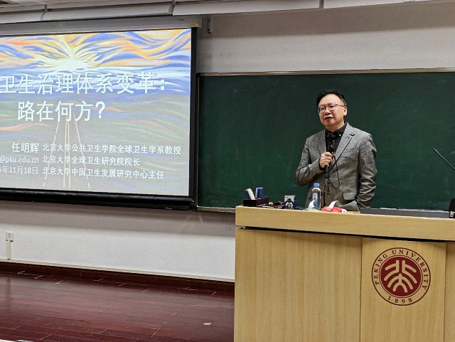 2025年11月18日晚,北京大学国际关系学院举行《国际组织与全球治理前沿名家系列讲座》第九场讲座。北京大学公共卫生学院教授、北京大学全球卫生研究院院长、世卫组织前助理总干事任明辉教授以“全球卫生治理体系变革:路在何方?”为题,为同学们带来了一场精彩讲座。北京大学博雅特聘教授、国际关系学院副院长、国际组织与国际公共政策系系主任张海滨教授致欢迎辞,吴昊助理教授主持讲座。来自国际关系学院、燕京学堂、政府管理学院、新闻与传播学院等多个院系的近200名中外本硕博学生参加了此次讲座。