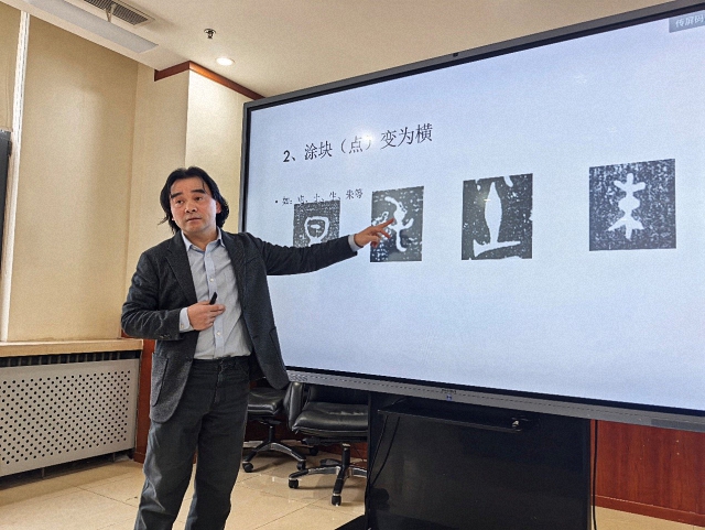 朱友舟从“六书”造字法出发,系统讲解了象形、指事、会意、形声等汉字构造方式,揭示汉字“法乎自然”的造字智慧。通过展示甲骨文、金文、篆书、隶书等不同时期的文字形态,讲座生动阐释了汉字从图形体到笔画体的演变过程,特别是“隶变”作为古今文字分水岭的重要意义。在“古汉字书法四美”环节,他引用梁启超的观点,指出书法具有“线的美、光的美、力的美、表现个性的美”,并结合早期青铜器铭文、楚简、汉帛等实物资料,展现了汉字书法在视觉与精神层面的双重魅力。他强调,书法绝非单纯的笔墨技艺,更是中华优秀传统文化的重要传承载体。书法是无图之画,是无言之诗,无声之乐,引导在座师生通过书法感受中华文化的博大精深,提升自身文化素养。此外,讲座内容还融入了国际视角,展示了汉字在埃及、澳大利亚等地的文化交流活动,体现了汉字作为中华文化载体在国际传播中的影响力。