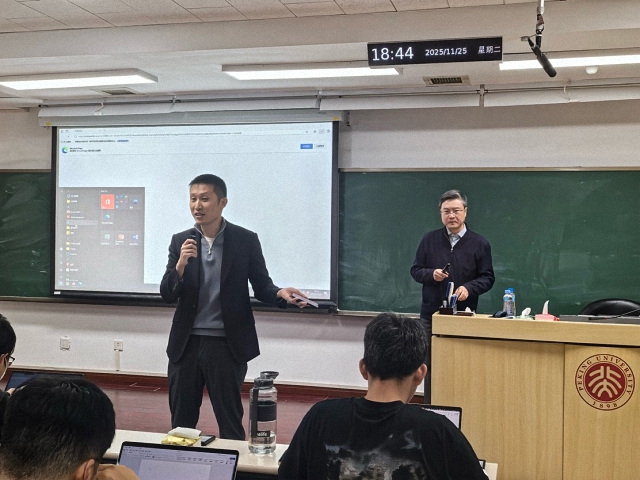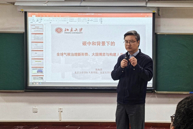 2025年11月25日晚,北京大学国际关系学院举办“国际组织与全球治理前沿名家系列讲座”第十讲。北京大学博雅特聘教授、国际关系学院副院长、碳中和研究院副院长张海滨应邀作题为“碳中和背景下的全球气候治理新形势、大国博弈与构建人类命运共同体”的专题报告。活动由国际关系学院助理教授吴昊主持,来自国际关系学院、工学院、信息科学技术学院、燕京学堂、政府管理学院等院系的近200名中外学生参加讲座。