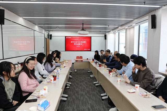 2025年12月5日中午,由北京大学国际关系学院和法学院联合开设的“涉外法治与全球治理”跨学科本科培养项目见面会在国关楼C201顺利举行。来自两院的学院领导、项目教师与首届同学齐聚一堂,围绕项目目标、培养路径与实习实践展开交流与答疑,在午餐会的轻松氛围中深化师生互动,为同学们的学习规划与成长路径提供指引。北京大学国际关系学院副院长归泳涛、助理教授刘璐、法学院副院长刘哲玮、长聘副教授左亦鲁、助理教授陈晓航,以及来自两院教务办公室的负责老师出席。