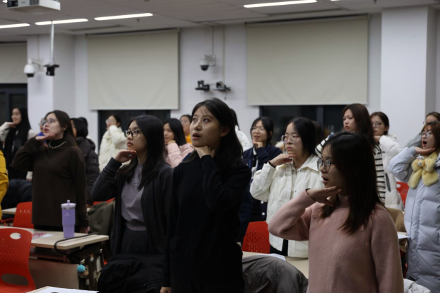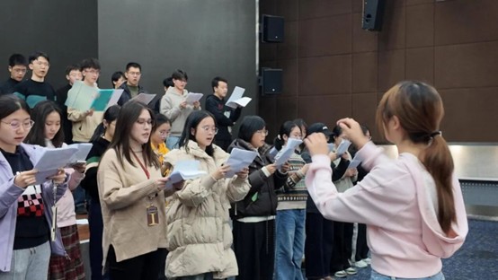 “梦回那段青春,执着遍遍。”这既是同学们反复唱诵的歌词,也是排练过程最真实的写照。担任主排的杨洁瑜学姐从基础发声练习开始,细致耐心地引导大家渐入佳境。从腹式呼吸、气息练习,到发声位置、音阶开嗓,教室中回荡的声音从生涩逐渐变得饱满洪亮。