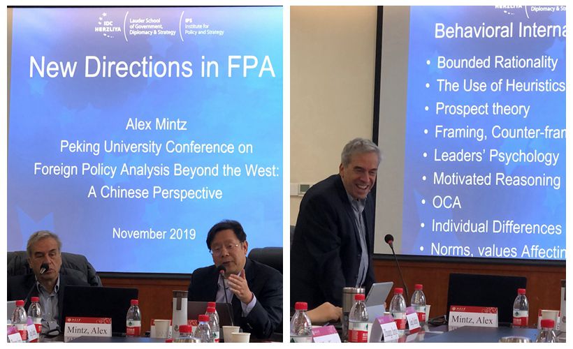 受北京大学海外名家讲学计划项目的资助,以色列赫兹利亚跨学科研究中心大学的明茨(Inter-discipline center IDC Herzliya Alex Mintz)教授从2019年11月11日到19日在给北京大学国际关系学院进行了为期八天的访学,给外交学专业的硕士和博士研究生授课四次,共十二个小时。分别讲授了对外政策分析学科的最新发展方向,重点讲授了他自己发展和形成的多元启发(Polyheuristic),多元思维(Polythink),对外政策的主要研究方法,特别是他自己发展起来形成的高级决策分析法(Advanced Decision Analysis),以及决策种类、决策要素、决策环境、决策原则、决策偏见等。这些都是我们在对外政策分析教学过程中所没有的东西。授课内容充实丰富,与学衡互动性强,既有讲授,又有课堂练习,教学效果良好,收到同学们普遍欢迎。