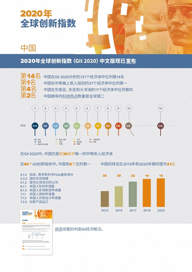 2020年9月2日,世界知识产权组织(WIPO)在日内瓦发布了以“谁为创新出资?”为主题的《2020年全球创新指数(GII)》。中国的排名今年保持在第14名,仍然是GII前30位中唯一的中等收入经济体。