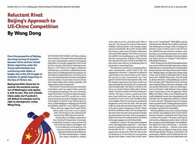 2021年12月,北京大学国际关系学院长聘正教授、中外人文交流研究基地执行主任王栋在国际知名期刊《环球亚洲》(Global Asia)发表题为《不情愿的对手:中国应对中美竞争的策略》(“Reluctant Rival: Beijing’s Approach to US-China Competition”)的英文刊首文章(leading article)。文章针对中国如何应对美国所定义的中美“战略竞争”关系这一重要的现实问题,作了详细阐述。文章指出,中国成为美国的竞争对手“并非情愿”,中国既不想挑起与美国的冲突,也不渴望霸权。但是,如果美国步步紧逼,那么中国将坚定捍卫自身的利益和发展的权利。目前而言,稳定中美关系、防止中美陷入新的冷战,仍然是中国对美政策的关键目标。