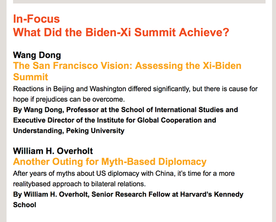 在专题文章中的另外一篇文章里,欧威廉指出,多年来,美国政府的对华政策一直被一种不切实际的目标,“神话”(myth)所笼罩,即关于通过与中国的外交可以或应该实现什么。“不切实际的神话”的外交政策已经成为特朗普、拜登执政期间的常态。文章指出,拜登政府试图遏制中国的技术发展,公然放弃在台湾问题上对中国的承诺,这并不是“去风险”(de-risking),而是在“增风险”(up-risking)。美国政客们可以愚弄选民,认为关税可以保护或重置就业岗位,但美国企业却面临着失业的现实。“旧金山峰会”,尤其是习近平主席与美国企业家的会见,为“务实的思维”(reality-based thinking)重回美国政治环境带来了一些希望。