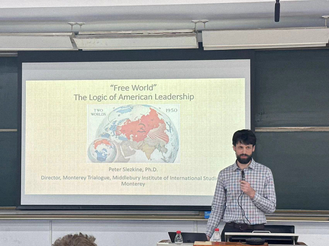 2024年5月7日,蒙特雷国际关系研究院“蒙特雷三边对话”主任、华东师范大学博后研究员Peter Slezkine应北京大学美国研究中心邀请,以“美国关于‘世界领导地位’观念的历史变迁”为主题作专题讲座。讲座由北京大学国际关系学院教授、美国研究中心主任王勇主持,评论人是北京大学国际关系学院副教授节大磊,校内外40余位师生参加了交流和讨论。