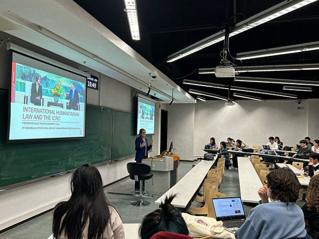 2024年11月25日晚,红十字国际委员会东亚地区人道事务与政策主管Graziella Leite Piccoli(葛慈)女士走进《联合国与国际组织》课堂,为来自国关、新传、外院、法学院、燕京学堂等多个学院的同学讲授“国际人道法与红十字国际委员会(ICRC)”。Piccoli女士在红十字国际委员会工作近三十年,曾多次前往伊拉克、加沙、喀布尔等武装冲突现场组织人道主义救援和协调,现任红十字国际委员会东亚地区人道事务与政策主管。讲座由国际关系学院助理教授赖华夏主持。