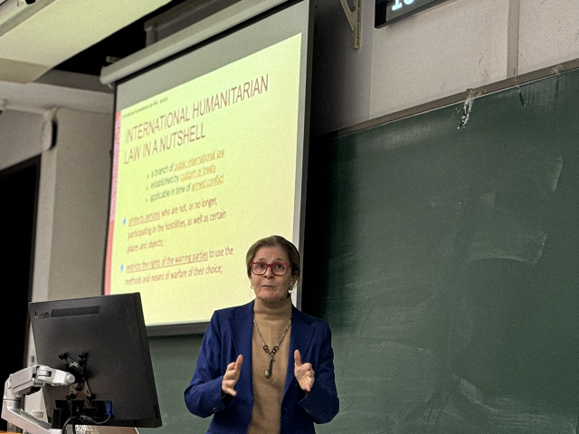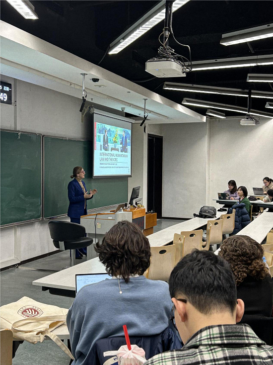 Piccoli女士强调,国际人道法通过规制武装冲突行为,在武装冲突中挽救生命,减轻苦难,体现人道主义精神。作为一个独立且中立的组织,红十字国际委员会成立于 1863 年,总部位于日内瓦,在全球 80 多个国家拥有约 18,000 名员工。其主要活动涵盖保护、援助、预防和合作四个领域,凭借其中立性、独特的历史使命、与冲突各方对话的能力和广泛的合作网络,在人道领域发挥着重要作用。Piccoli女士与同学们分享了自己在加沙的亲身经历。在叙利亚地震和俄乌冲突等人道危机中,红十字国际委员会积极行动,保护平民和民用基础设施,提供医疗援助,促进人质释放,修复水设施等,为缓解人道灾难做出了努力。她还特别提及中国在人道行动中日益增长的作用,包括在促进国际人道法、开展人道主义对话、与武装部队合作以及全球健康外交等方面的积极贡献。