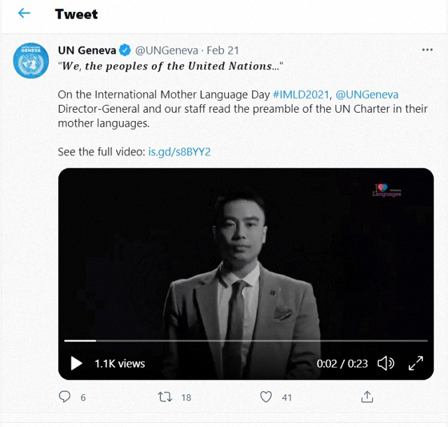 在实习的尾期,欧阳瑞泽被选拔为“国际母语日”活动的中文推广者,与20余名其他母语推广者一道朗诵《联合国宪章》。“用是发愤立志,务当同心协力,以竟厥功。”在宣传片中可以看到,这句章文由欧阳瑞泽用中文朗诵演绎,铿锵大气。中文是联合国六种官方语言文字之一,是世界上母语使用者人数最多的语言文字,而且是全球最古老、唯一延续至今的语言文字。中文的博大精深和中华文明的渊源流长,都是我们文化自信的深厚底蕴。欧阳瑞泽说,“作为新时代的中国青年,我们不仅要坚守传承,更要积极推广”。