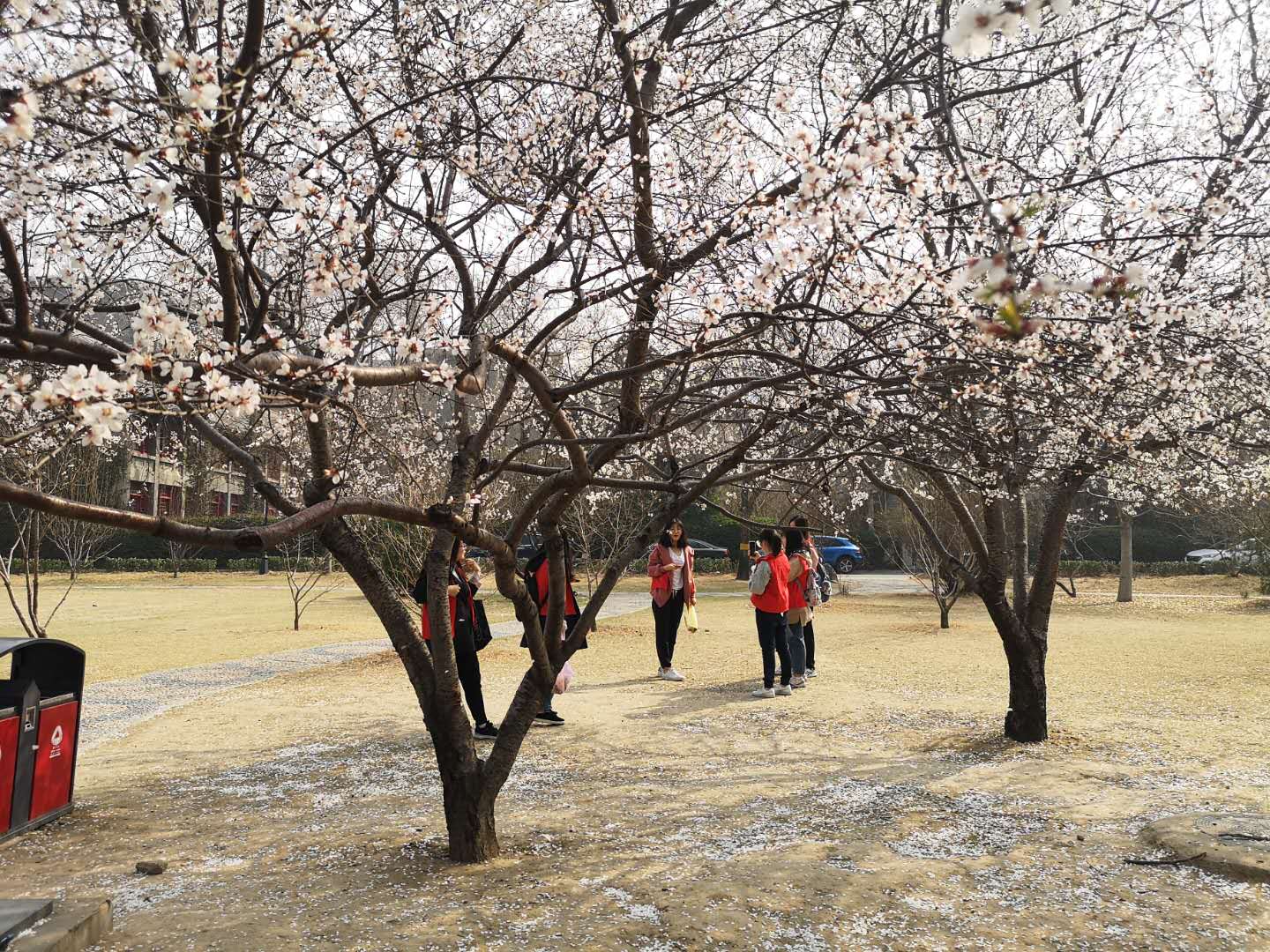 静园的三月正是春意盎然的时节,志愿者们的红色马甲和枝头绽放的粉白色花交相辉映,构成了静园一道靓丽的风景线。经过两个小时的清理,未名湖畔和静园已不再有垃圾煞人风景。