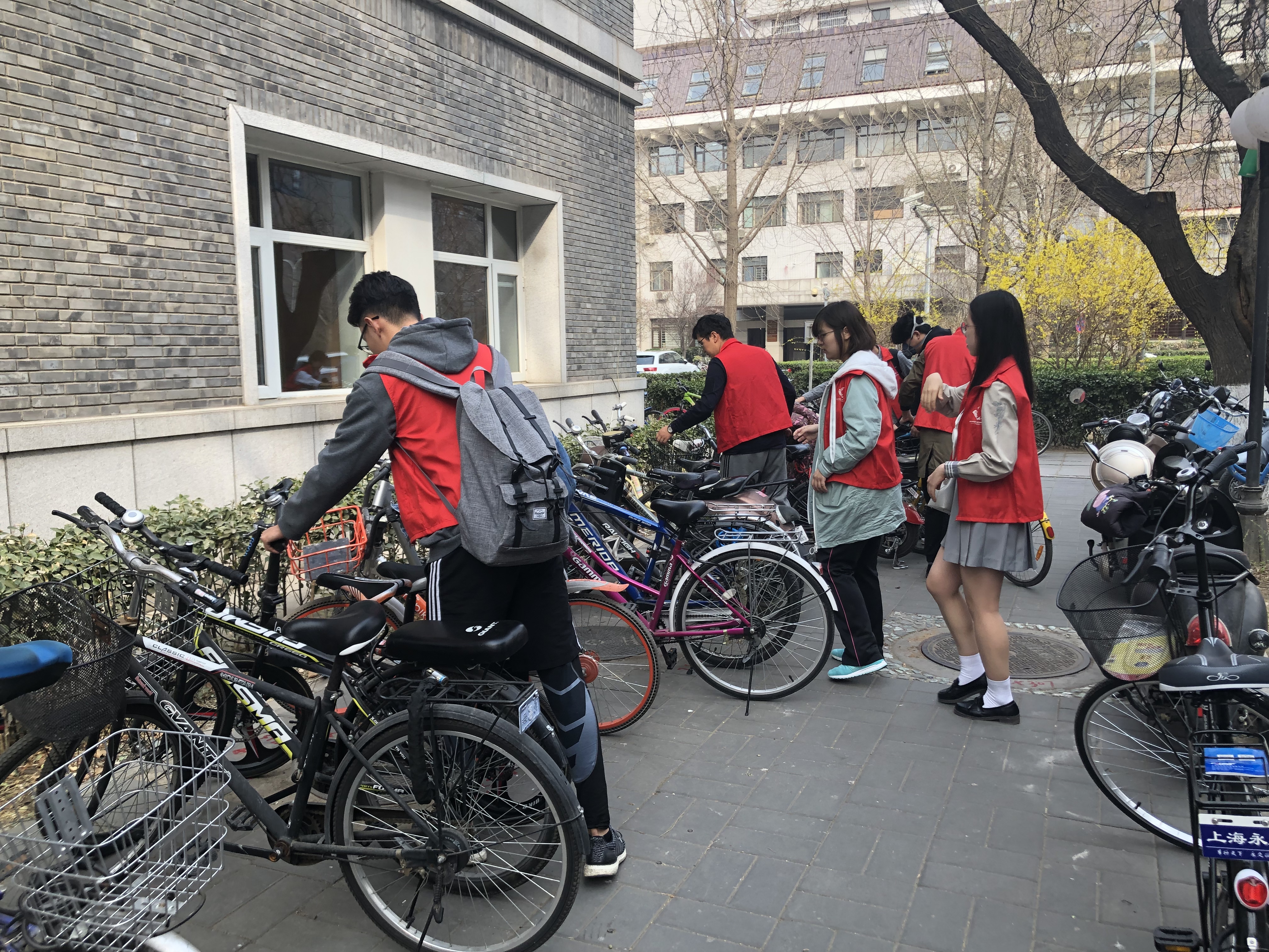 负责二教、三教及农园食堂附近自行车摆放任务的志愿小组由11位同学组成。下午三点,志愿者们于第二教学楼签到、领取服装并分组开展活动。志愿者协助回收零散的共享单车,扶起被风刮倒的车辆,调整车间空隙,将车头扭转至同一方向。完成计划任务后,志愿者们还自发地集合起来,去往校园内其他的自行车停放地进行整理。经过志愿者们的努力,原本散乱不堪的停车地变得整齐划一,给同学们带来了极大的方便。