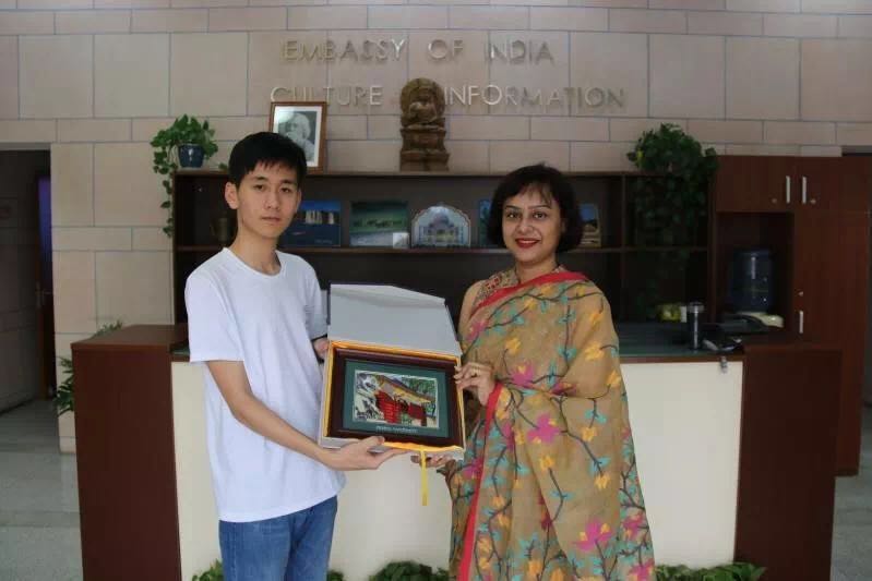 最后,学生代表向文化参赞赠送了具有北大特色的绢画以表达对印度大使馆及其招待人员的谢意。参赞十分喜欢我们的赠礼,并表示对我们的拜访感到由衷的高兴。
