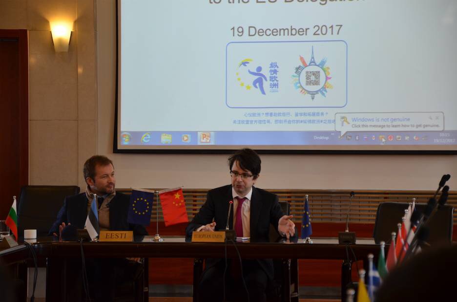 随后,欧盟驻华代表团政治、新闻与信息部部长Asad Beg先生、贸易和投资部的MadeleineKihlberg女士、教育文化参赞Marcin Grabiec先生、新闻处处长William Fingleton先生分别从政治、经贸、文化教育以及纵情欧洲项目这四个方面做了认真详细的介绍。