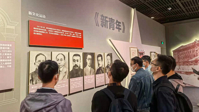 一组新文化运动旗手们的照片,一艘嘉兴南湖纪念红船的模型,一块写有九十年前入党誓词的红布,一段记录开国大典真实情景的影像······一件件展品静静地陈列在首都博物馆三层特展展厅,引得众多参观者驻足凝视和思考。现场同学们结合自身所学专业,对特展中涉及的重要人物、实物和事件进行学习和讨论。中国共产党领导人民创业的过程是艰辛和不易的,而革命先辈所秉持的坚守和奋斗精神,让同学们深深为之感动和钦佩。