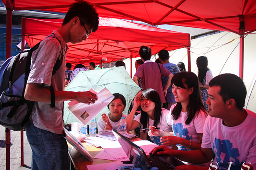 2013级本科新生在师兄师姐的热情指引下进行报到程序