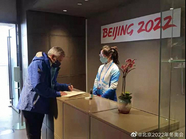 (李嘉馨为国际奥委会北京2022年冬奥会协调委员会主席胡安·安东尼奥·萨马兰奇办理登记手续)