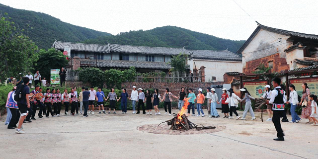 7月30日下午,实践团师生走访新街镇上马台村,这个过去被称为“上马台上去下不来,骑着骡子滚下来”的小贫困村在2002年走上了易地扶贫搬迁、疏通交通的蜕变之路。二十年过去,上马台村依托民族特色文化优势,建设民族特色文化墙、休闲文化走廊、彝族文化传承馆,积极举办对歌、摔跤、拔河等丰富多彩的民俗活动,在保护彝族民族文化的同时,将文化特色转化为吸引游客、加快文旅发展的经济优势。在彝族特色饭店,实践团师生同热情的彝族村民们祝酒唱歌,在篝火舞会中深悟彝族民俗风情文化;“走是要走了,哪个舍得你”,伴着彝族送别曲《舍不得》,实践团师生满载收获而归。