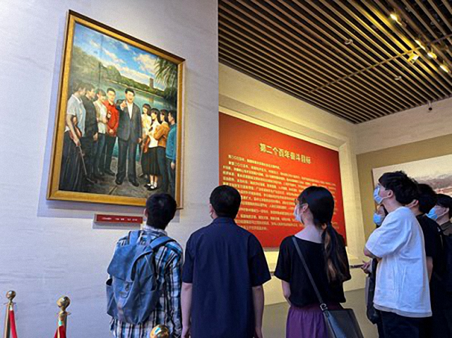 漫步展览馆中,参访的同志们仿佛置身一本立体的党史教科书,每处细节都能引起大家的共鸣与沉思。在第九展厅参观新时代主题展览时,同学们深刻感受到新时代十年党和国家事业取得的历史性成就和历史性变革。参观结束后,同志们面向鲜红的中国共产党党旗重温入党誓词,铿锵有力的宣誓声响彻大厅。