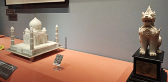 1954年印度赠送的大理石泰姬陵模型(左)与缅甸赠送的象牙雕狮(右)