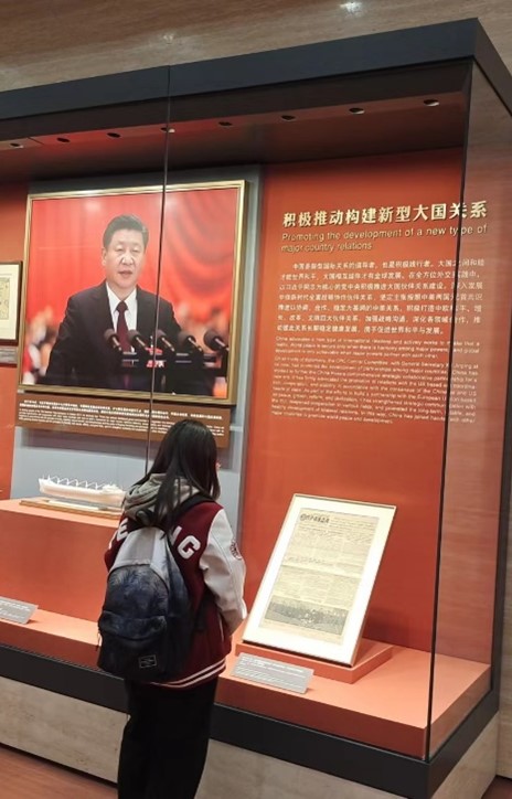 走进展厅,同学们陆续参观了新中国成立以来同人民民主国家、亚非拉第三世界国家、西方国家建立外交关系时的赠礼,一件件精美但又不失历史厚重感的展品,生动展现了新中国走向国际舞台的稳健步伐。