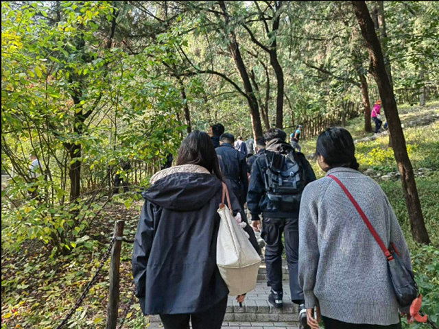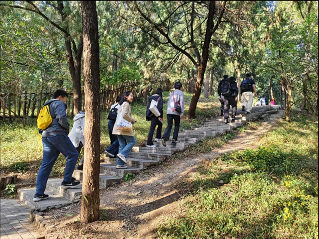 10月24日下午,同学们齐聚百望山森林公园,踏上秋日山林小道,融入自然。百望山丰富的植被和优美的生态环境展现了其在绿化造林和生态保护方面的重要性,鼓励大家关注环保,践行绿色生活。与此同时,百望山还是北京市重要的革命历史纪念地,园内设有首都绿色文化碑林、游击队之林、黑山扈抗日战斗纪念园等多处红色历史文化旅游景点,激励后人缅怀先烈,铭记历史。一路上,同学们欣赏着红黄相间的秋叶,沐浴在清新的空气中,时而远眺北京城,感受静谧的自然之美,身心得到极大放松。在经过老一辈革命家的碑林时,同学们都驻足缅怀,向为英勇报国奉献一生的爱国志士们致以崇高敬意。