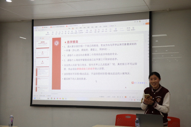 读书会结束后,在团支书赵一鸣同学的主持下,同学们在轻松愉快的氛围中,进行了名字接龙游戏,通过自我介绍、记忆同学名字和专业方向,以及名字替换等环节,增进了彼此之间的了解。随后的你画我猜游戏更是将活动推向高潮,同学们分为两组,通过语言与肢体描述竞猜关键词,展现了团队合作精神和创造力。在你画我猜游戏环节中,关键词不仅涉及国际关系学院与专业知识,如“School of International Studies”“孟什维克”“米尔斯海默”,而且涵盖“不知天上宫阙”“过街老鼠”等诗词成语,台上同学声情并茂的演示更是让整个教室到处洋溢着全体师生欢快爽朗的笑声。