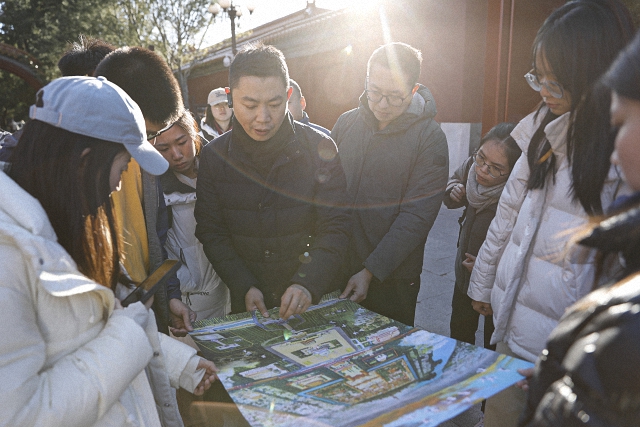 在正式开始第二阶段参访前,讲解老师通过地图向大家详细介绍了北京中轴线上的其他系列建筑及其各自所承载的文化理念。此外,讲解员老师特别强调,直到今天我们仍然在保护和发展着这条中轴线,比如人民大会堂和国家博物馆这两座国家级建筑依然沿中轴线对称分布,这充分显示出了这条中轴线的生命力和中国人“致中和”的价值追求。