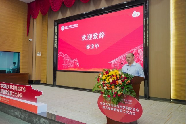 院友会副会长、广州工商学院董事长邵宝华对国际关系学院院友会第五届理事会第二次会议的召开表示衷心祝贺,对各地院友嘉宾的到来表示热烈欢迎。他指出,北京大学历史悠久、兼容并蓄,他不断从北大求学的经历中得到滋养,已将勤奋严谨、求实创新的精神融入血脉,也融入到广州工商学院的办学理念中,孜孜求索、开拓进取,力争创建特色鲜明的高水平应用型大学。