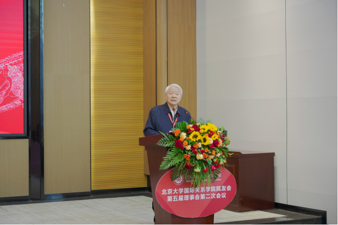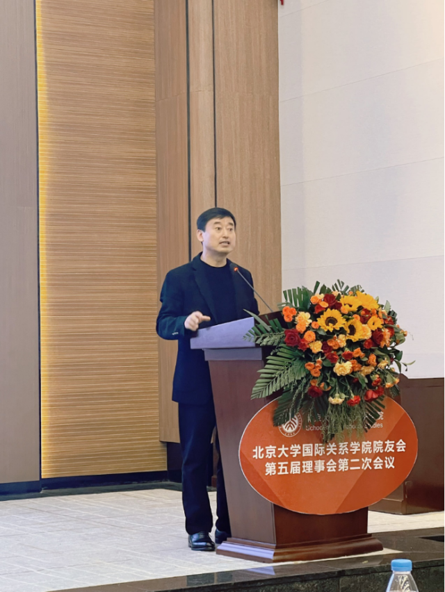 院友代表、原文化部部长蔡武在致辞中表示,院友会第五届理事大会第二次会议的召开对于促进学院和院友会的发展意义重大。北大精神、国关精神是每一个院友与学院之间最牢固的精神纽带,在思想文化激荡的当下更显出其重要与可贵。北大求学、国关求知的经历不仅仅助其在学术方面形成系统的科学构架,在思想认识论方面得到科学的训练,更使其在理想信念、精神生活方面得到滋养。他指出,国关院友会2000年成立以来,已经与学院形成了你中有我、我中有你的紧密依存关系。从国关大楼的建设修缮到教学科研的创新支持,院友们众志成城,结合自身工作的实际,积极贡献了自己的脑力、物力与人力。他期待,在党和国家发展进入新时代、新阶段、新征程的重要历史时刻,院友会工作也应守正创新,解放思想,真正把院友会建设成为广大院友的精神家园,给予院友们以源源不断的依赖感、归属感和安全感。