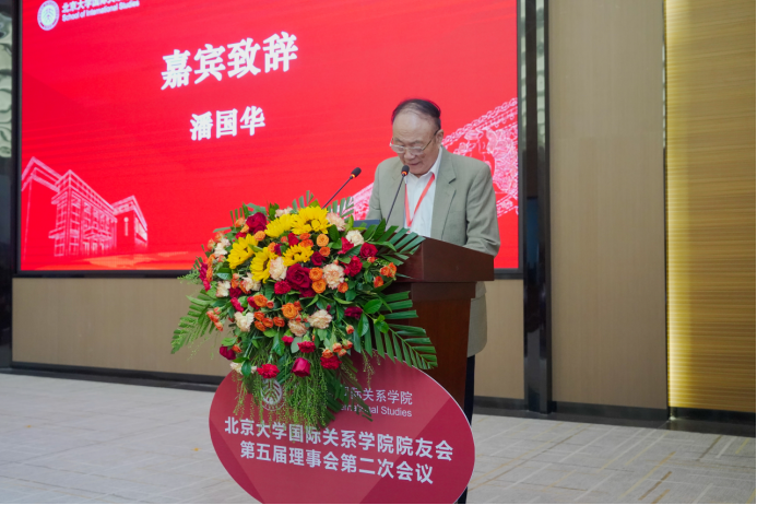院友会名誉会长潘国华对本次会议的召开表示祝贺,对各位院友欢聚一堂、共谋发展,以及长期以来对学院的关心和支持表示感谢。他指出,从院友会的发起建设,到学科专业的设置,以及教师出访的申请、研究中心的成立,学院的方方面面得到了院友们精神物质的大力支持。各位院友团结一致、坚持不懈地为教育事业和学院发展做贡献,是他最美好的回忆,为此感到无比自豪。他希望学院继续重视院友工作,根据新变化探索调整发展道路,兼顾“走出去”与“请进来”,推动智慧共享;也期待各位院友常怀感恩、关爱之心,以院为家,常回家看看,多多提出批评与建议,凝心聚力,共同促进国关学院以及院友会的发展。